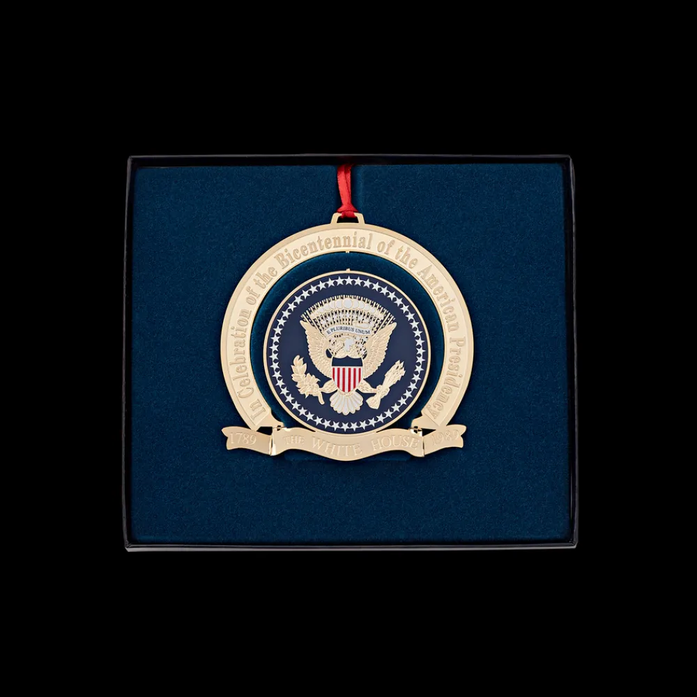 The White House Christmas Ornament for 1989 celebrates the 200th anniversary of the Presidency of the United States.