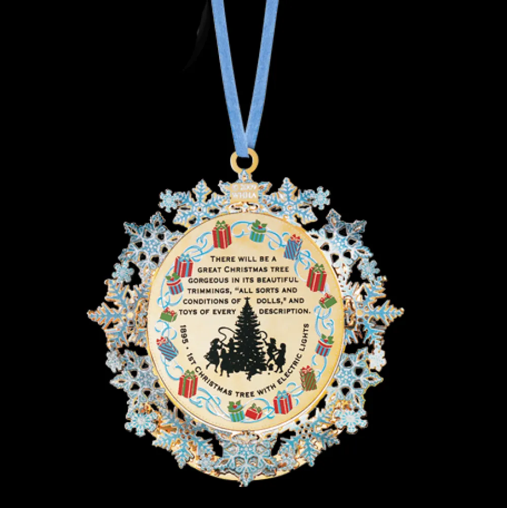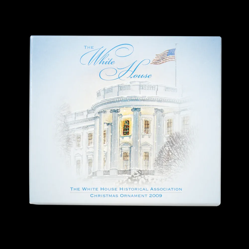 The only president of the United States elected to two non-consecutive terms, Grover Cleveland served as the 22nd president from 1885 to 1889 and as the 24th from 1893 to 1897. The 2009 White House Christmas ornament commemorates the 24th presidency and it is the second of two produced in Cleveland’s honor by the White House Historical Association. This second ornament illustrates the special place of the Christmas tree in the holiday celebrations of President Cleveland’s young family. The central hologram depicts the south façade of the White House after an evening snowfall. The warm glow of the first Christmas tree to be illuminated by electric lights is seen through the tall windows of the second floor Oval Room beyond the center of the columned portico. This softly colored view is based on a modern watercolor rendition by Margaret Huddy, a Washington, D.C.-based painter. The reverse side of the ornament recreates a scene from the tree-trimming parties of President and Mrs. Cleveland, which were held annually for their children and those of cabinet members. The words of a period newspaper report help to describe the president’s delight in preparing Christmas day for his young family. A finely crafted gold finished wreath of snowflakes, painted ice blue and white, frames the oval ornament.