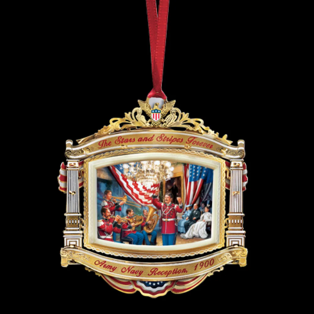 The 2010 White House Christmas ornament honors President William McKinley, 25th President of the United States, (1897 -1901), and celebrates the role of music in the traditions of the White House. The McKinley administration is remembered as a time when the nation moved beyond its continental boundaries to become an international power. The American people idolized McKinley during his presidency, so suddenly cut short by an assassin’s bullets six months into his second term. In celebration of the nation’s patriotic mood as the century turned, the illustrations commissioned for the President William McKinley White House ornament feature festive, colorful scenes from the annual Army Navy Reception at the White House in 1900. The front face of the Christmas ornament for 2010 depicts members of the United States Marine Band performing on the snow covered North Drive as arriving guests disembark from their carriages. The reverse side of the ornament shows the band playing for President and Mrs. McKinley and their party in the flag bedecked splendor of the East Room. It was in this High Victorian East Room that the McKinleys began the era of “musicales” (receptions with music as the leading feature) at the White House, a tradition that continues to this day.