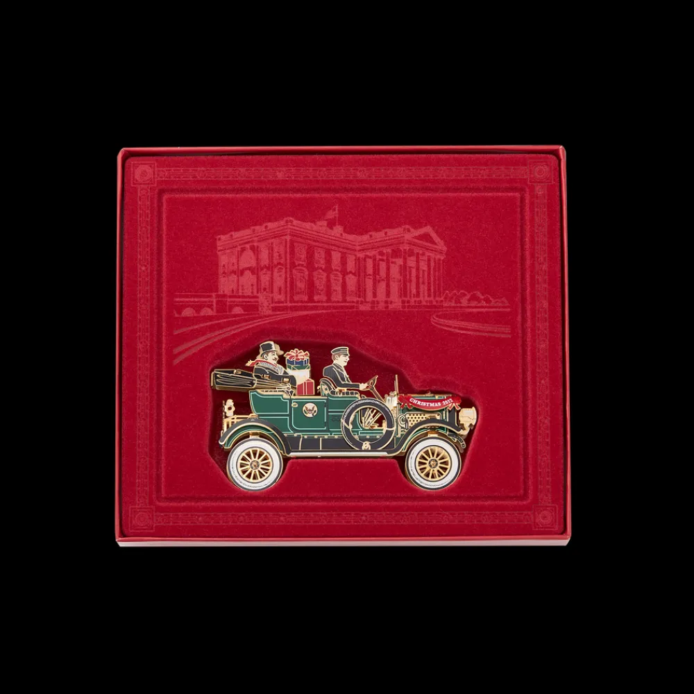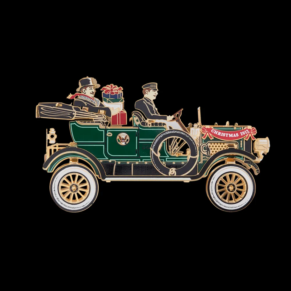 The Official 2012 White House Christmas Ornament honors President William Howard Taft who introduced the automobile to White House transportation in 1909, breaking a long presidential tradition of reliance on horse-drawn vehicles. The ornament celebrates Taft’s adoption of the automobile, his love of manufacture and invention, and his ready acceptance of modernity. It depicts President and Mrs. Taft enroute to deliver Christmas presents. They are seated behind chauffeur George H. Robinson in the White Motor Company’s Model M, a seven passenger steam-powered touring car embellished with the Great Seal of the United States on the doors. The color, as described at the time, is “a harmonious blend of subdued greens.” The President William Taft White House ornament for 2012 is made in the United States of highly-polished brass with a coating of nickel, finished in 24-karat gold.