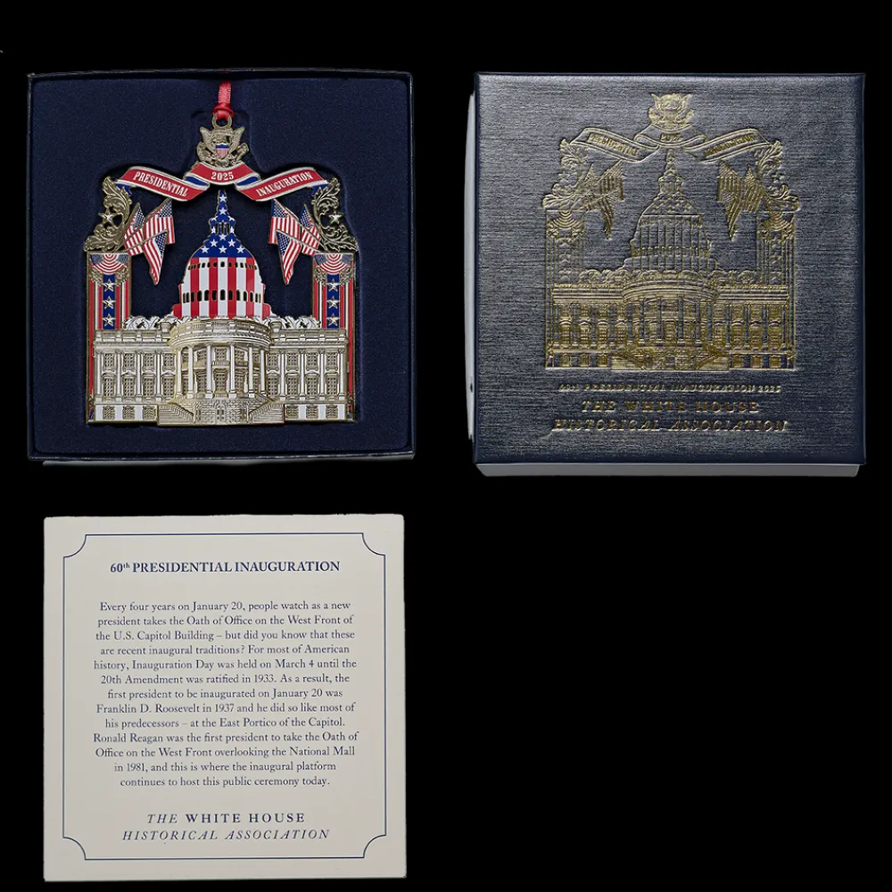 Commemorate the 60th Presidential Inauguration in 2025 with this USA made, brass ornament finished with 24K gold. Exceptionally detailed, etched designs depict a South Portico view of the White House on one side and the West Front of the U.S. Capitol Building on the opposite side. Adorned with USA flags and stars, this ornament also features headline text “2025 Presidential Inauguration”.