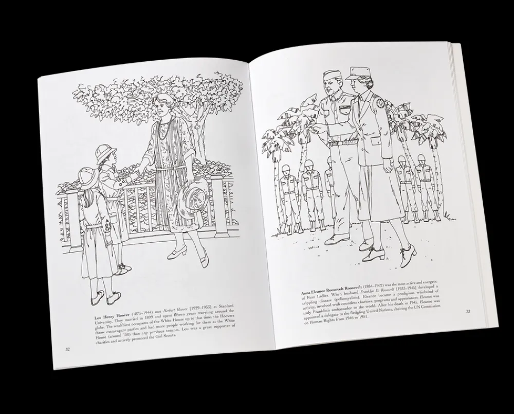 These 44 ready-to-color drawings depict first ladies from Martha Washington to Michelle Obama in authentic settings in Washington and around the globe.