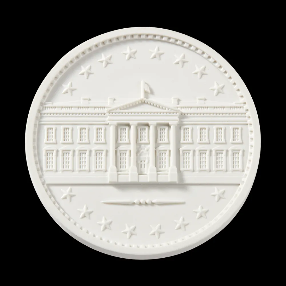 The Aquia, Virginia, sandstone that makes up the exterior walls, embellishments, and window surrounds of the White House was was also used to create this challenge coin.