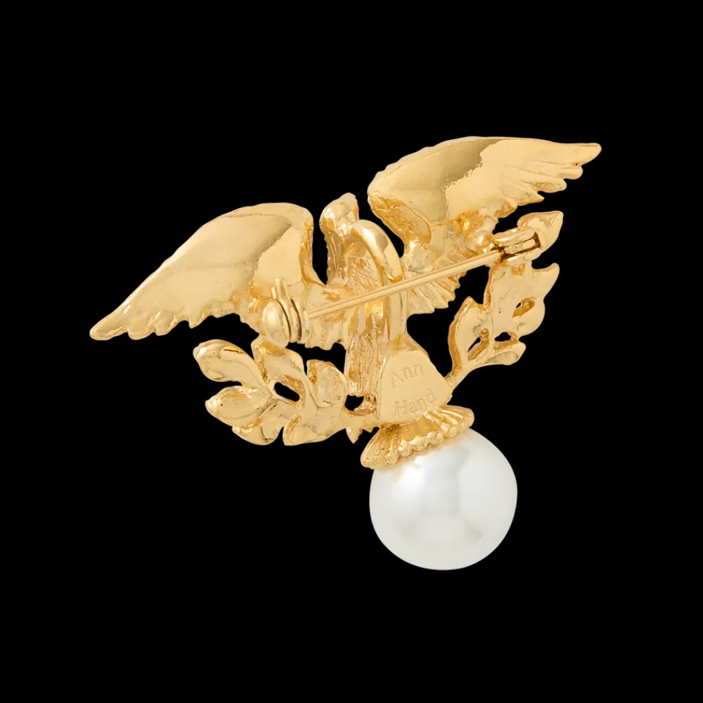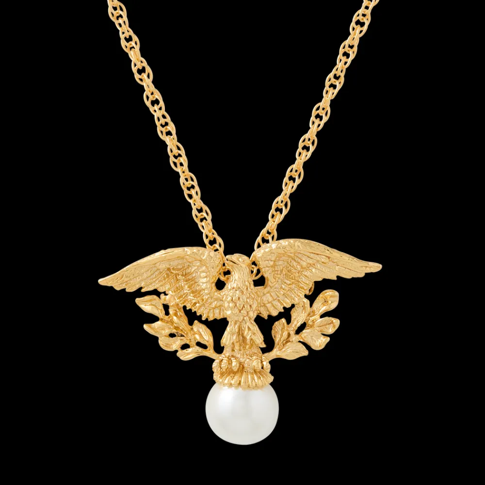 The stately pin and pendant is a versatile piece that celebrates the symbolism of the American Bald Eagle. This piece soars whether adorning a jacket or worn with the accompanying 22″ chain as an evening necklace. Gold plate over pewter featuring a lobster clasp.