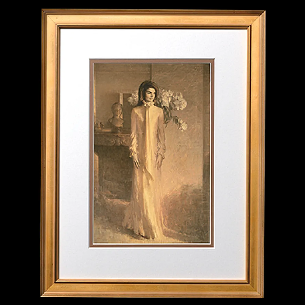 First Lady Jacqueline Kennedy was the wife of President John F. Kennedy, the thirty-fifth president of the United States from 1961 to 1963. Her official White House portrait was painted by Aaron Shikler in 1970 and now hangs in the Vermeil Room.