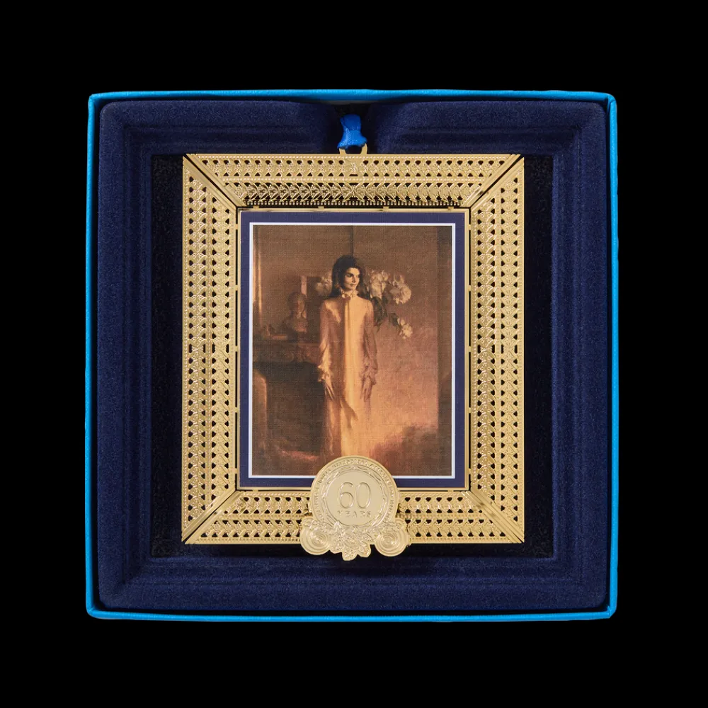 On February 23, 1961, First Lady Jacqueline Kennedy launched the most celebrated redecoration of the White House in its history, undertaking an ambitious plan to acquire the finest period furniture, with which the historical integrity of the Executive Mansion’s interiors would be restored. Recalling a disappointing childhood tour with little history to impress her, she was determined to make her new home “the most perfect house in the United States.” Within a year, a committee was formed, a law passed, donations sought, a nonprofit chartered, and a museum-quality collection of historic furnishings established. Mrs. Kennedy’s time in the White House, however, was abruptly cut short on November 22, 1963, with the assassination of her husband President John F. Kennedy. Jacqueline Kennedy returned to the White House only once after departing through the East Garden on December 6, 1963. During a private visit in 1971, she would view her official portrait by Aaron Shikler, which is featured on this ornament. While the portrait preserves her likeness for posterity, her transformational vision for the White House, so masterfully executed in barely one thousand days, is preserved in the fabric of the historic interiors and through the work that has been carried on by the White House Historical Association, the private nonprofit partner she founded. Incorporated on November 3, 1961, to enhance the public’s “understanding, appreciation, and enjoyment of the historic White House,” the Association continues to share and preserve the history of the White House with ever evolving and expanding initiatives. As the steward of the living legacy of the Kennedy restoration, the Association not only looks ahead but embraces the past.