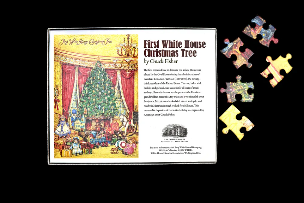 Made In The USACardboard Size Box: 10″” H x 8 1/8″W x 2 3/8″DFinished size 13″ x 19″Depicting Christmastime in President…