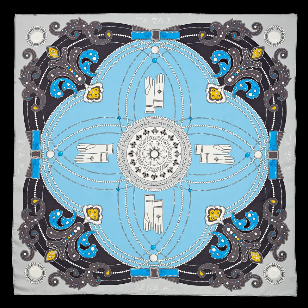 Today, Mrs. Kennedy remains a style icon for her own timeless and feminine approach to fashion. The pearls, white gloves, and bows with which she accessorized her pastel gowns inspired the design of this scarf, offered exclusively by the White House Historical Association.