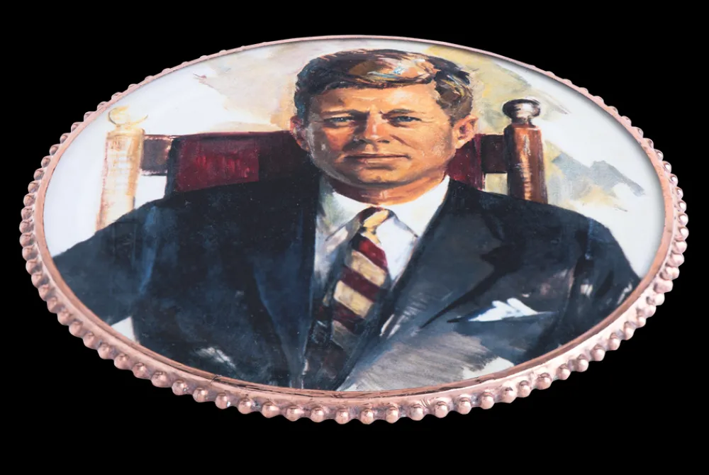 This stately wine coaster features a portrait by William Franklin Draper of John F. Kennedy, 35th President 1961 – 1963.