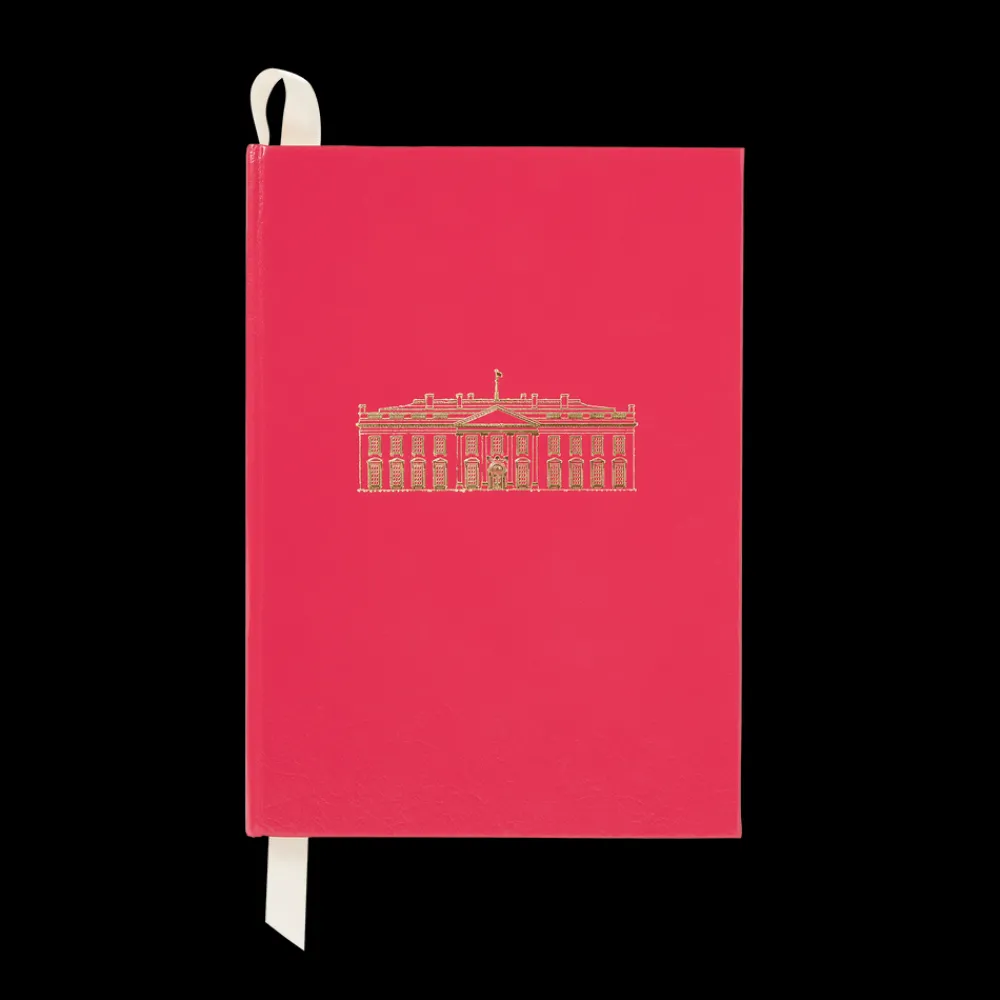 Ideal for the the office and any aspiring author, this leather bound notebook is a vibrant fuchsia. Embossed with the North Portico of the White House in gold. <