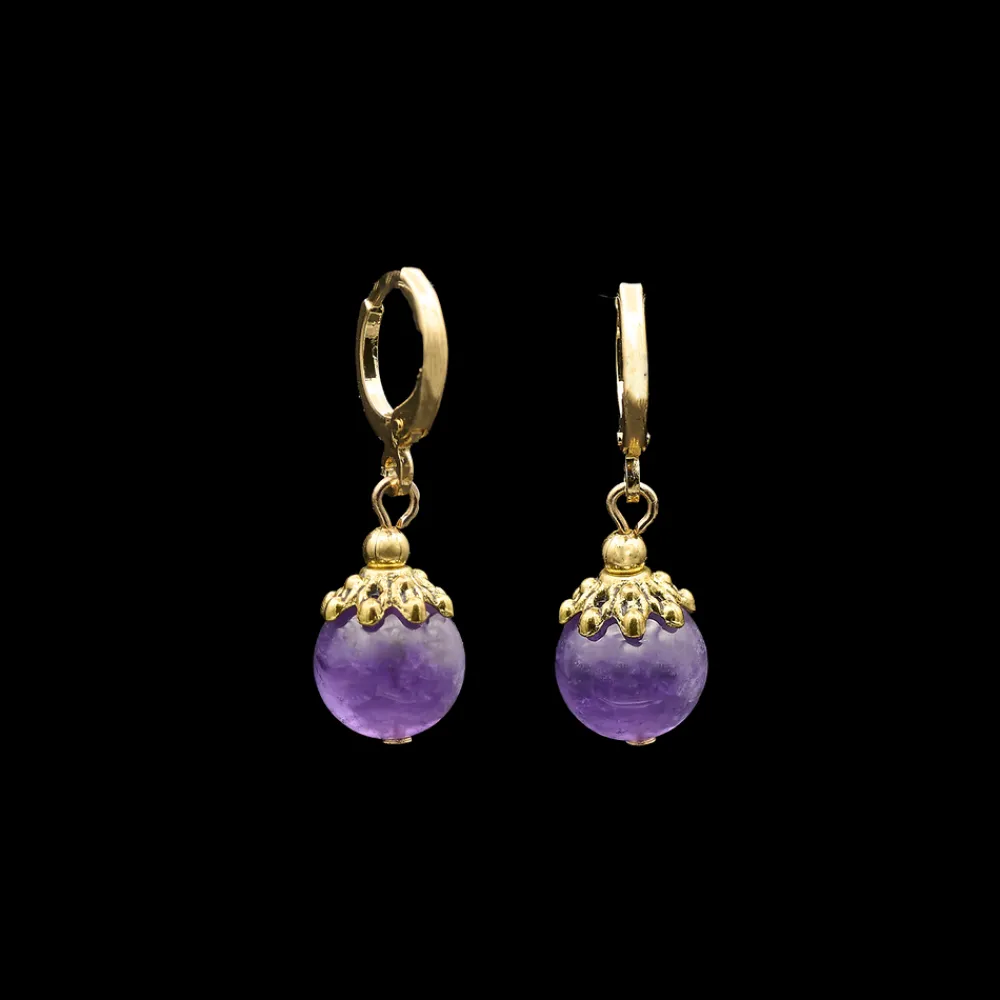 The “huggie” earring is a trendsetting and popular earring silhouette. These purple amethyst 10mm bead huggie earrings are 1 1/4-inch in length and hug the ear perfectly for a comfortable and eye catching pop of color. The 18-karat gold accents add a touch of elegance to any outfit.