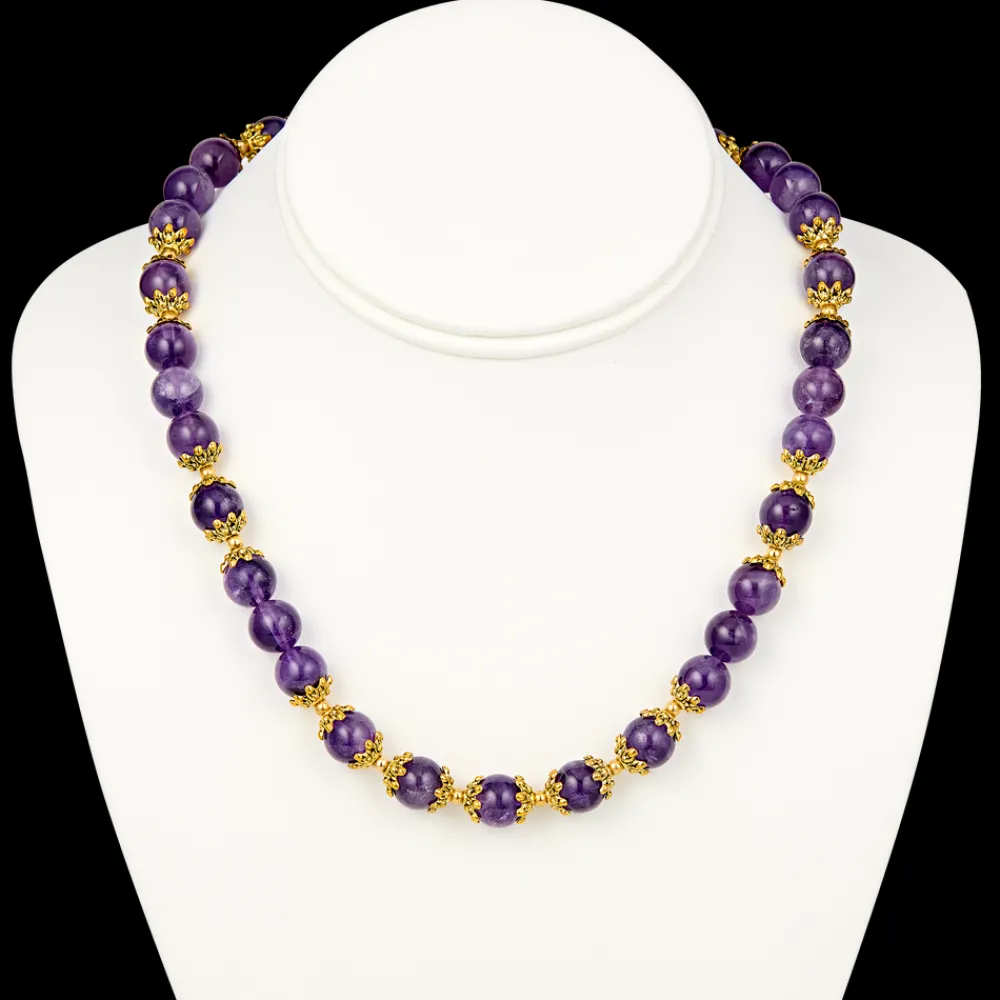 Elevate your jewelry collection with our stunning purple Amethyst Bead 16-inch necklace with gold accents. Crafted with exquisite 10mm amethyst stone beads and adorned with an ornate antiqued bead caps, this necklace evokes the quiet luxury and elegance of the Lincoln Presidential china collection itself. Perfect for adding a touch of sophistication to any outfit. Length is adjustable for an additional 2-inches length for best fit. Lobster clasp closure.