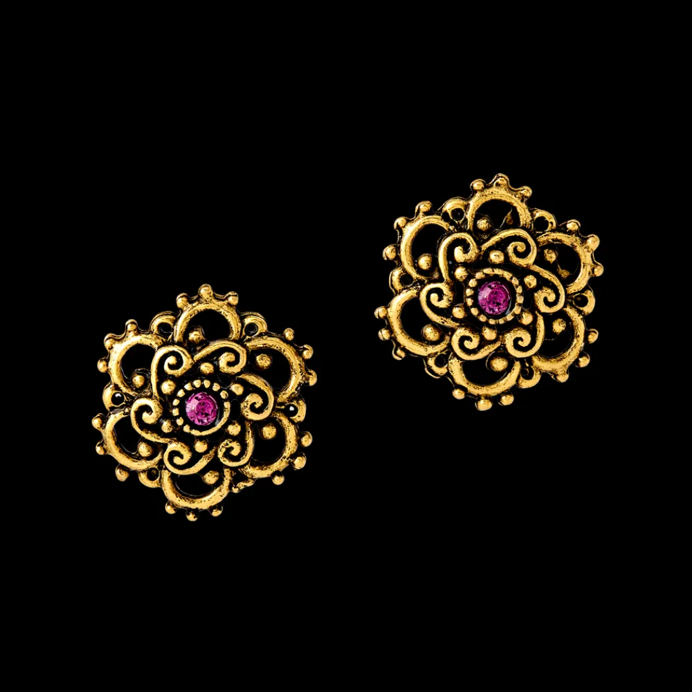 Finely crafted and elegantly designed, these antiqued gold openwork earrings feature a faceted purple crystal at its center. Made from gold-plated pewter, these 1/2-inch diameter post earrings have a subtle profile that is sure to add a touch of sophistication to any look.
