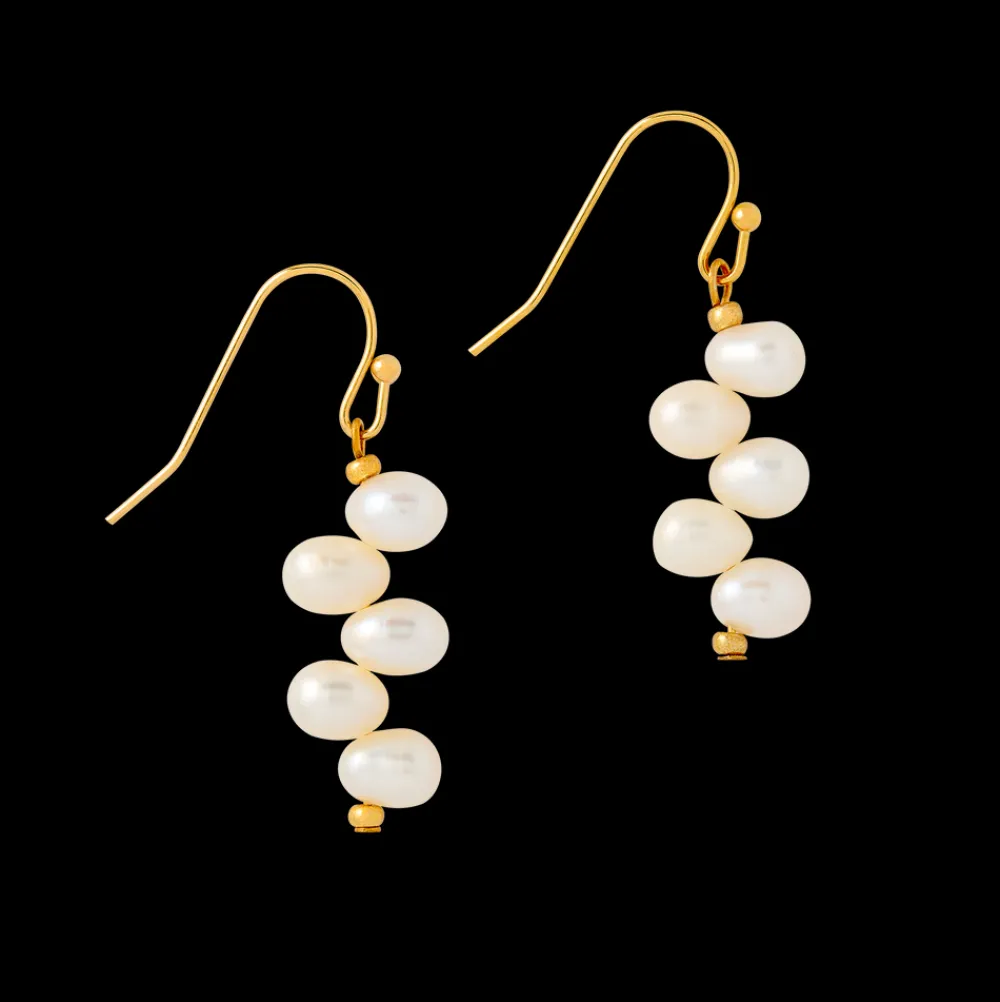 Stand out with these stunning, genuine 5-pearl earrings. Beautifully crafted on a gold plated brass ear wire, these genuine white pearls playfully dance off the ear making them a beautiful choice for a timeless look.