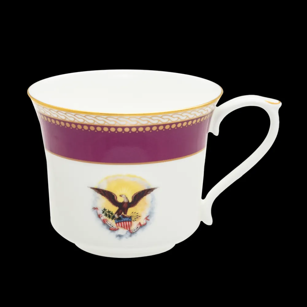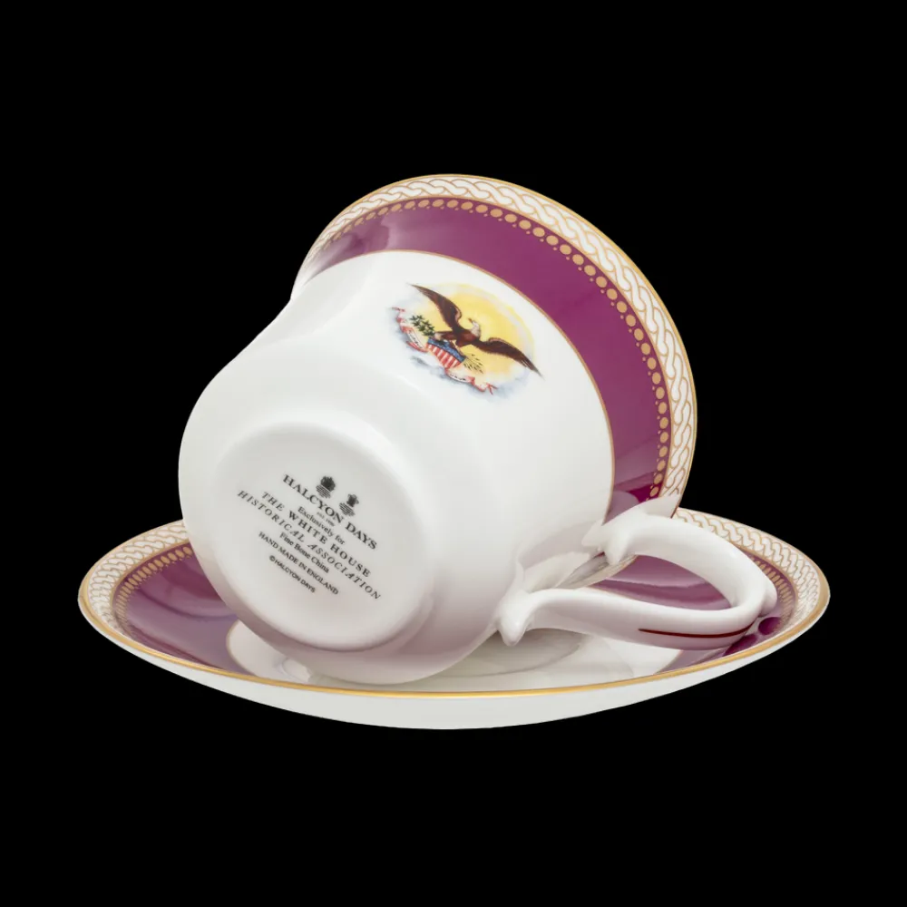 Produced exclusively for The White House Historical Association by Halcyon Days, the Lincoln Collection isinspired by President and Mrs. Abraham Lincoln’s White House china service. The porcelain dinner, breakfast, dessert, and tea service was purchased for the White House by First Lady Mary Todd Lincoln during an 1861 shopping trip to the E. V. Haughwout & Co. department store in New York City. The itemized bill included with Mrs. Lincoln’s new china includes the following description of her purchase, “One fine Porcelain Dining Service . . . decorated Royal purple, and double gilt, with the Arms of the United States, on each piece.” The beautiful state service, which originally included 190 pieces, was reordered during the presidencies of Ulysses S. Grant and Chester A. Arthur and examples are kept on display in the White House China Room today. This elegant tea cup and saucer ships in a beautiful giftbox and includes a descriptive insert about the collection. Handwash only.