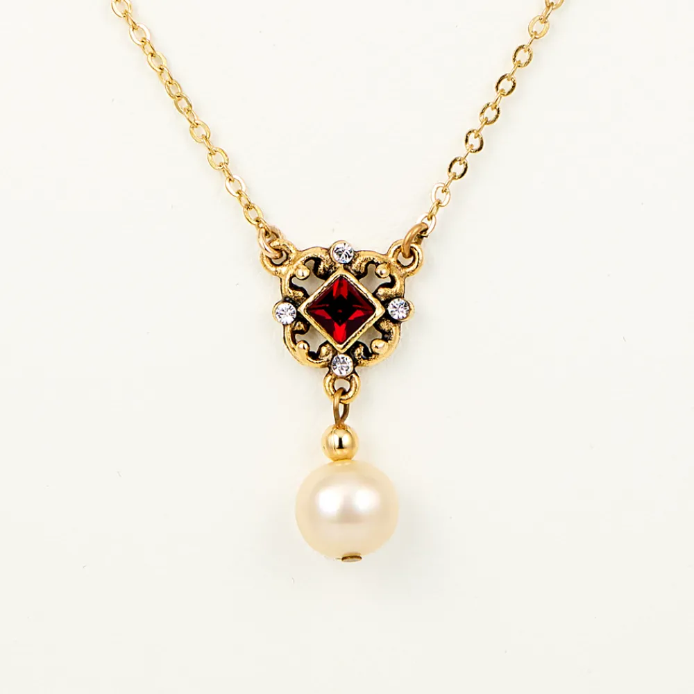 This pendant necklace was inspired by our best selling earrings from the Nancy Reagan jewelry collection. This necklace features genuine pearl accented with delicate red crystal, and is the perfect piece to elevate any ensemble. Necklace ships in branded gift box.