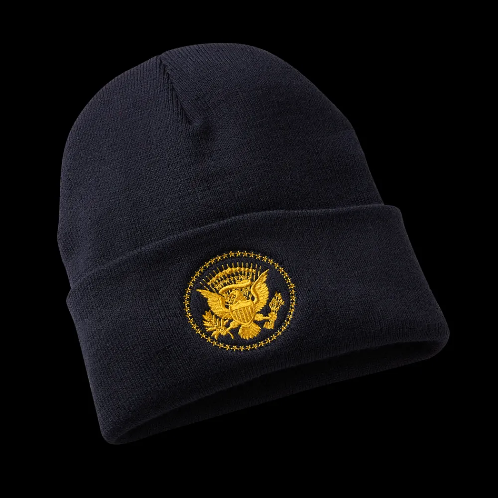 On October 25, 1945 President Harry S. Truman issued Executive Order 9646, which officially defined the Presidential Coat of Arms and Seal for the first time. An eagle’s head, which originally faced right toward a bundle of thirteen arrows held in its talons, was turned to face left toward the olive branch it held, symbolizing peace. Since 1945, the only changes made to the seal were the additions of the 49th and 50th stars. This navy knit beanie features the historic Truman Seal in gold. Unisex. One size fits all.