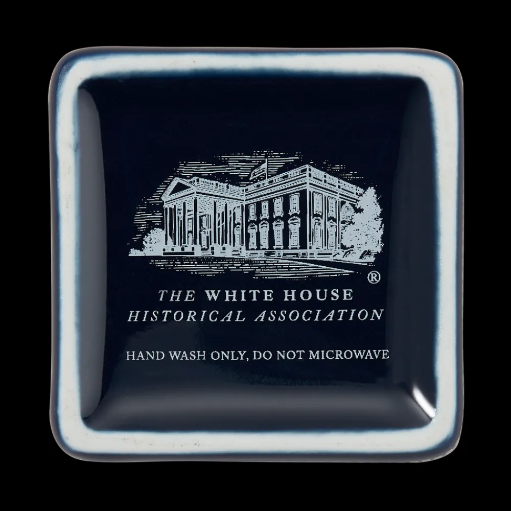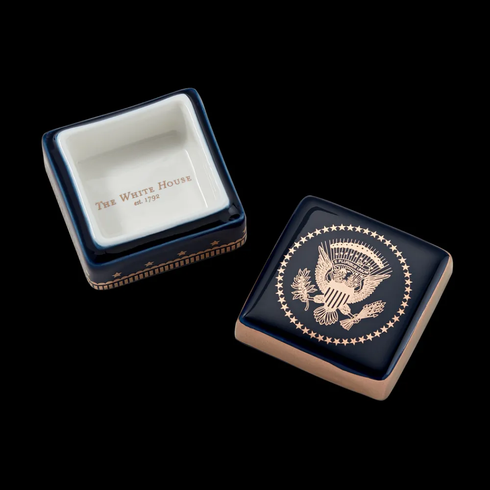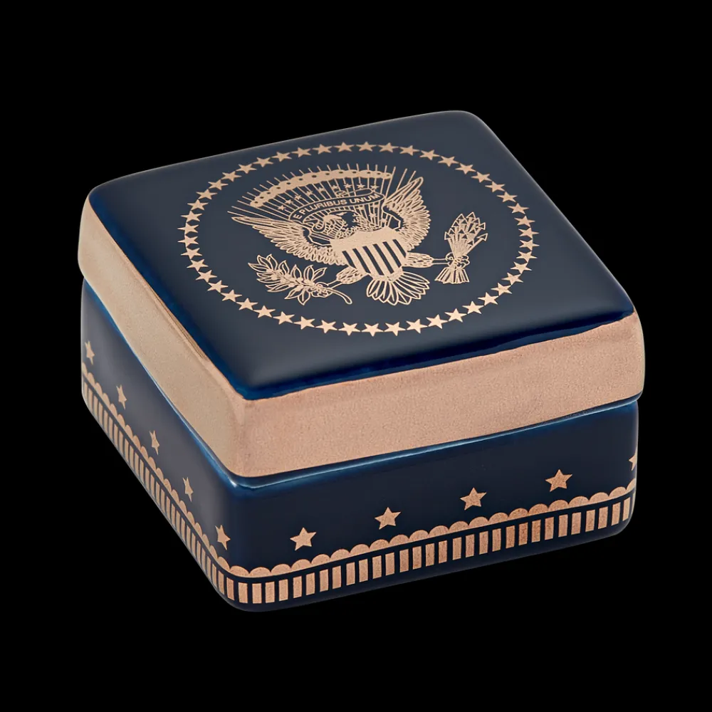 This small navy porcelain lidded box features the iconic Truman Seal in gold. On October 25, 1945 President Harry S. Truman issued Executive Order 9646, which officially defined the Presidential Coat of Arms and Seal for the first time. An eagle’s head, which originally faced right toward a bundle of thirteen arrows held in its talons, was turned to face left toward the olive branch it held, symbolizing peace. Since 1945, the only changes made to the seal were the additions of the 49th and 50th stars.