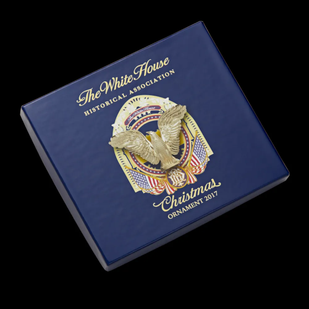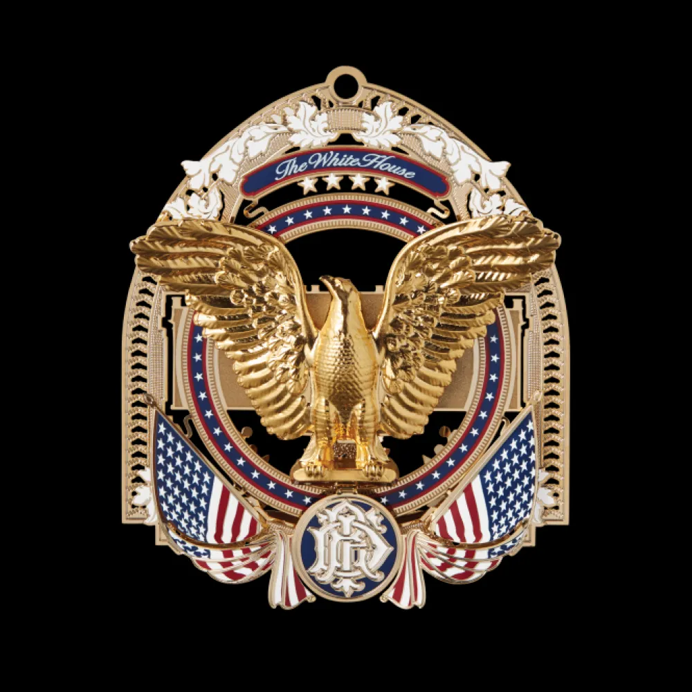 The Official 2017 White House Christmas ornament honors the administration of Franklin D. Roosevelt, who served as the thirty-second president of the United States from 1933 to 1945 and his remarkable journey to restore the faith of the American people. The ornament is crafted from shiny brass plated with nickel and 24-karat gold.