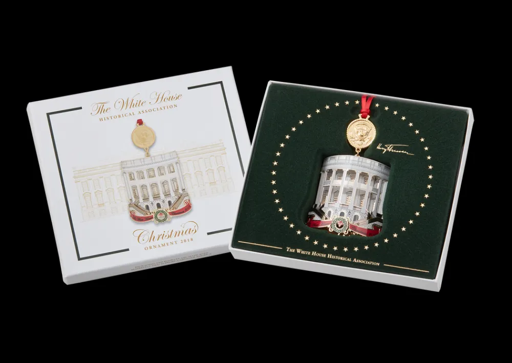 The White House Historical Association’s 2018 White House Christmas Ornament honors Harry S. Truman, the thirty-third president of the United States. This ornament is designed to illustrate three significant changes made by President Truman during his administration, one to the Presidential Seal, and two to the White House itself. One side of the ornament features his celebrated Truman Balcony, added in 1947–48 to the South Portico, and the other side features his renovated Blue Room, which, like all the rooms of the house, was dismantled and rebuilt during the renovation of 1948–52. These two images represent Truman’s White House alterations and restorations, the most extensive work on the house since President George Washington built it in the nation’s dawning and Presidents James Madison and James Monroe restored it after the fire in the War of 1812.