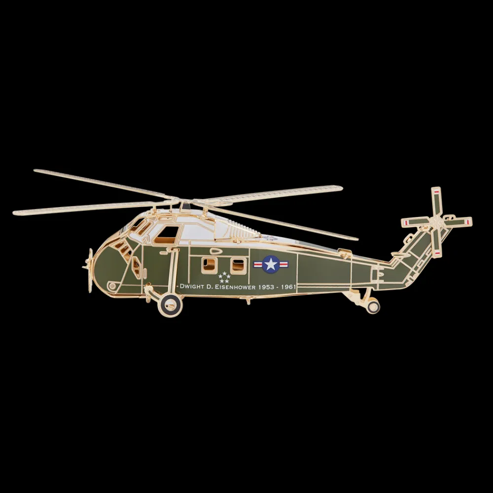 The White House Historical Association’s Official 2019 White House Christmas Ornament honors Dwight D. Eisenhower, the thirty-fourth president of the United States. This ornament symbolizes President Eisenhower’s commitment to innovation. Eisenhower was the first president to fly in a helicopter while in office in July 1957, and thereafter the helicopter became a feature of White House life. It was often used by the president to commute short distances, demonstrating to the public and indeed the world that it was safe.