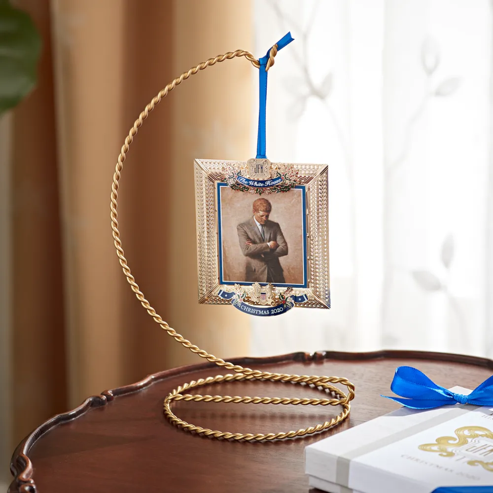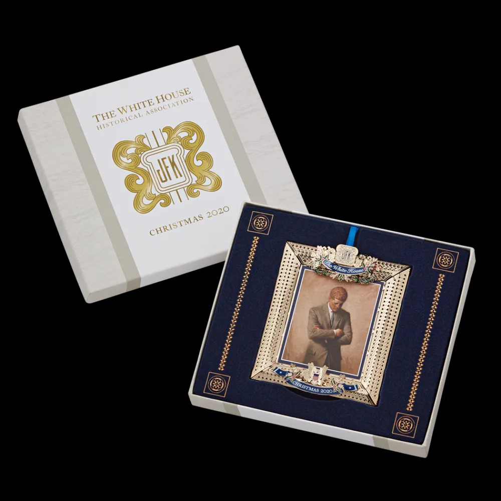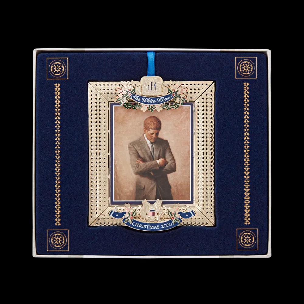 The White House Historical Association’s Official 2020 White House Christmas Ornament honors John Fitzgerald Kennedy, the thirty-fifth president of the United States. The youngest president since Theodore Roosevelt, Kennedy took office in January 1961, at age 43. Before his vibrant presidency was cut short by an assassin’s bullet on November 22, 1963, he had invigorated the American spirit. His legacy lives on in his youthful belief in America and his faith in America’s responsibilities to the world.