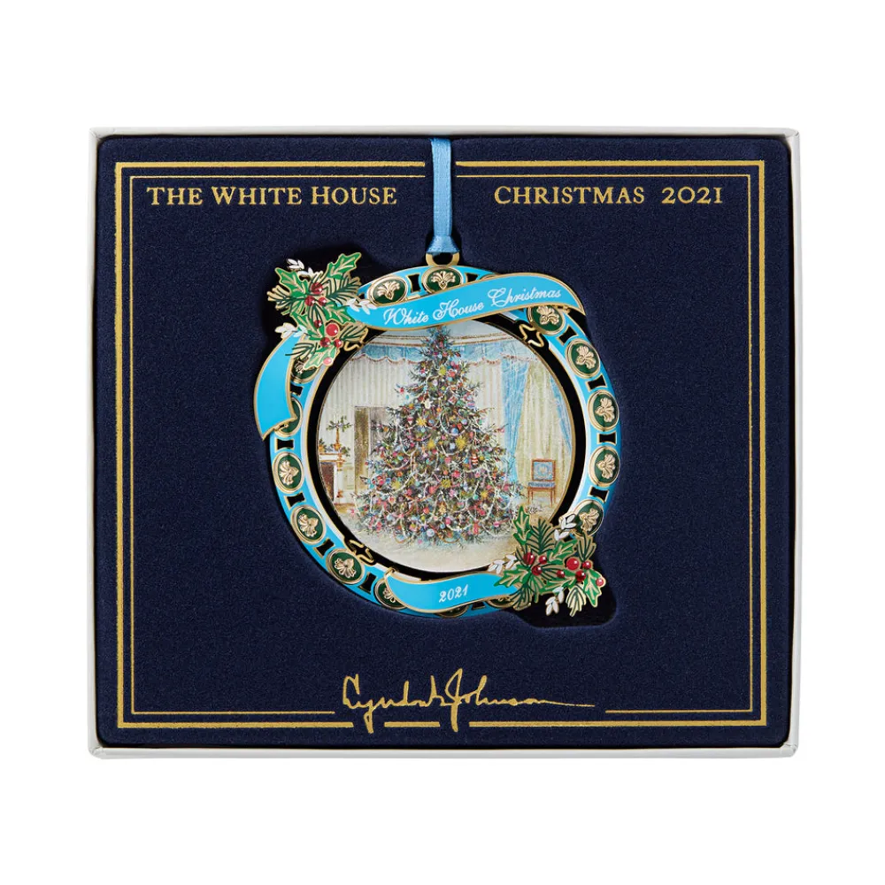 The White House Historical Association’s 2021 Official White House Christmas Ornament commemorates the presidency of Lyndon Baines Johnson. One side of the ornament features a painting of the 1967 Blue Room Christmas Tree. Mrs. Johnson requested that Robert H. Laessig, a designer for American Greetings, paint the official Christmas tree in the Blue Room for their card that year. The 1967 White House Christmas card was sent out by President and Mrs. Johnson to White House staff members, family, and friends.