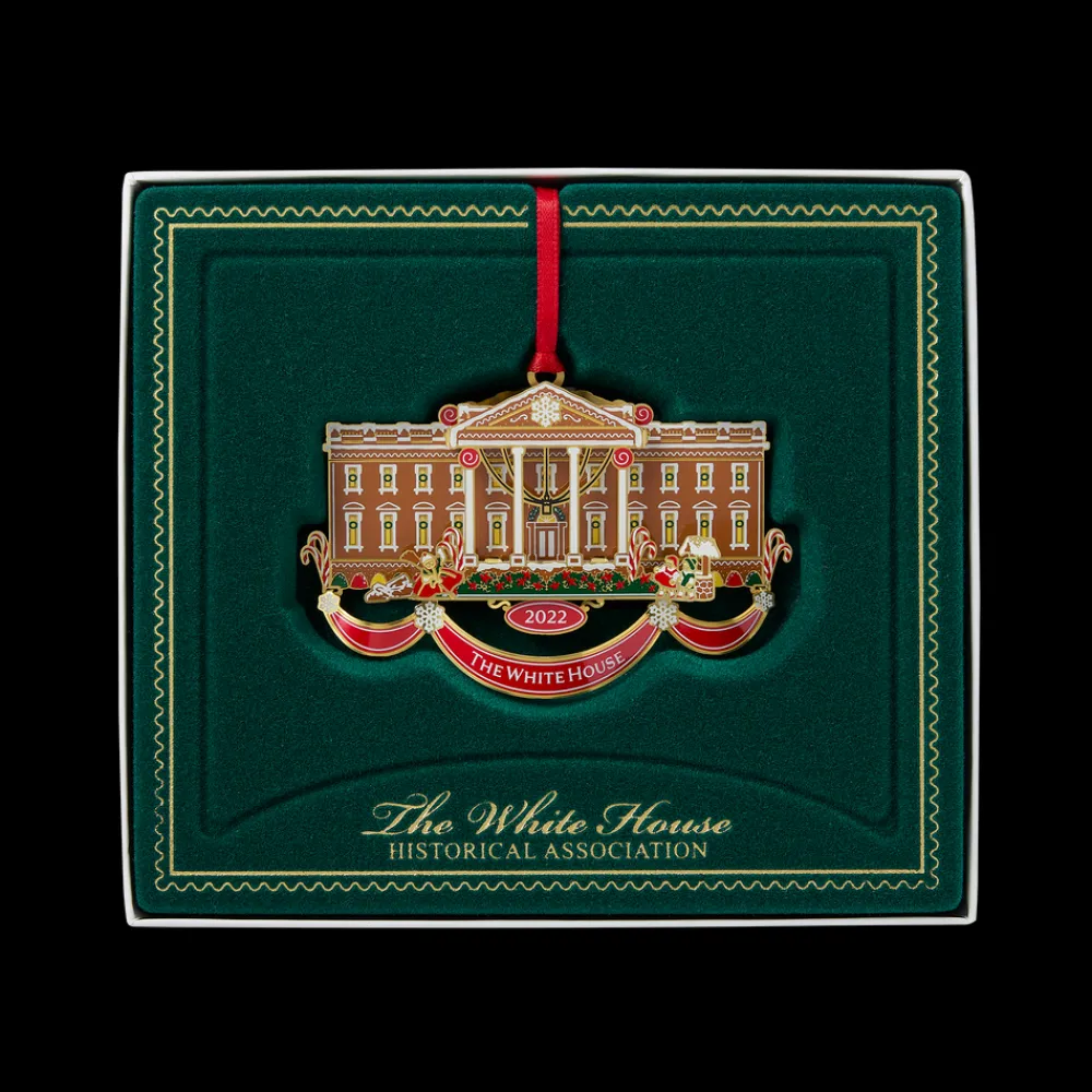 The White House Historical Association’s Official 2022 White House Christmas Ornament represents the cherished White House tradition of displaying a gingerbread house each holiday in the State Dining Room.