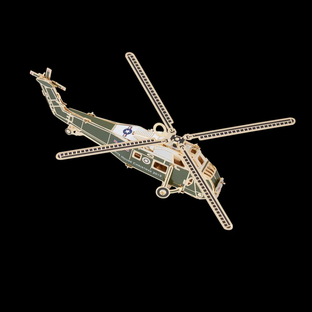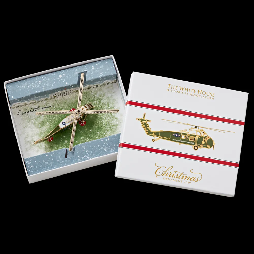 2019 Ornament: The White House Historical Association’s Official 2019 White House Christmas Ornament honors Dwight D. Eisenhower, the thirty-fourth president of the United States. This ornament symbolizes President Eisenhower’s commitment to innovation. Eisenhower was the first president to fly in a helicopter while in office in July 1957, and thereafter the helicopter became a feature of White House life. It was often used by the president to commute short distances, demonstrating to the public and indeed the world that it was safe.