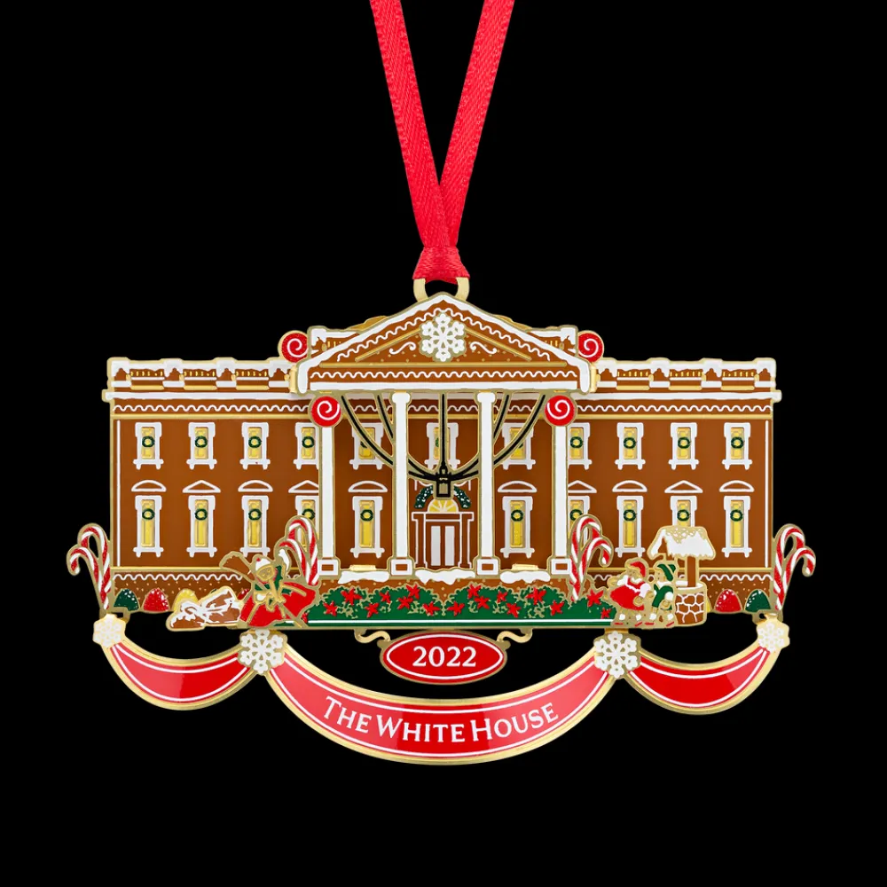 2022 Ornament: The White House Historical Association’s Official 2022 White House Christmas Ornament represents the cherished White House tradition of displaying a gingerbread house each holiday in the State Dining Room. A perfect addition to any holiday tree, this American-made holiday ornament illustrates this decades-long tradition, complete with delicate icing, red and white striped candies, gumdrops, and candy canes. If you look closely, you can even see little gingerbread children frolicking in front of the North Portico. Included with this beautifully gift-boxed keepsake is a gingerbread scented insert, booklet, and recipe card featuring a gingerbread recipe from First Lady Pat Nixon’s time at the White House.