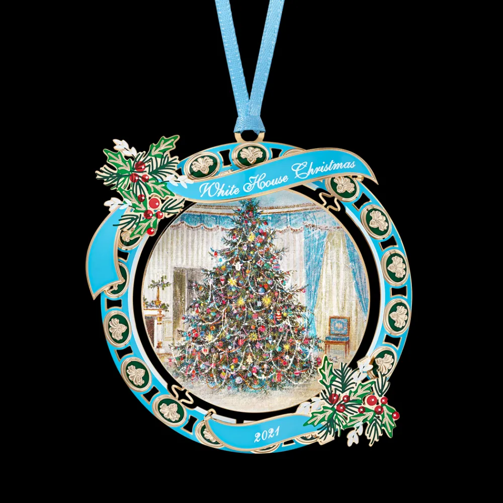 2021 Ornament: The White House Historical Association’s 2021 Official White House Christmas Ornament commemorates the presidency of Lyndon Baines Johnson. One side of the ornament features a painting of the 1967 Blue Room Christmas Tree.