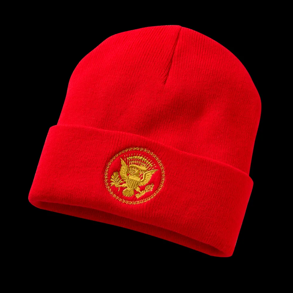 On October 25, 1945 President Harry S. Truman issued Executive Order 9646, which officially defined the Presidential Coat of Arms and Seal for the first time. An eagle’s head, which originally faced right toward a bundle of thirteen arrows held in its talons, was turned to face left toward the olive branch it held, symbolizing peace. Since 1945, the only changes made to the seal were the additions of the 49th and 50th stars. This red knit beanie features the historic Truman Seal in gold. Machine wash cold, lay flat to dry.