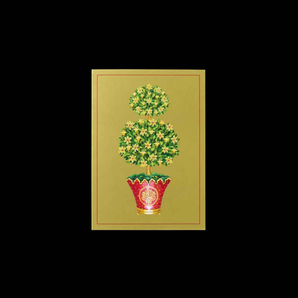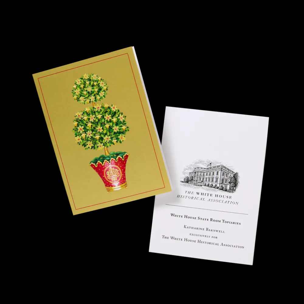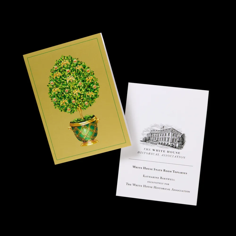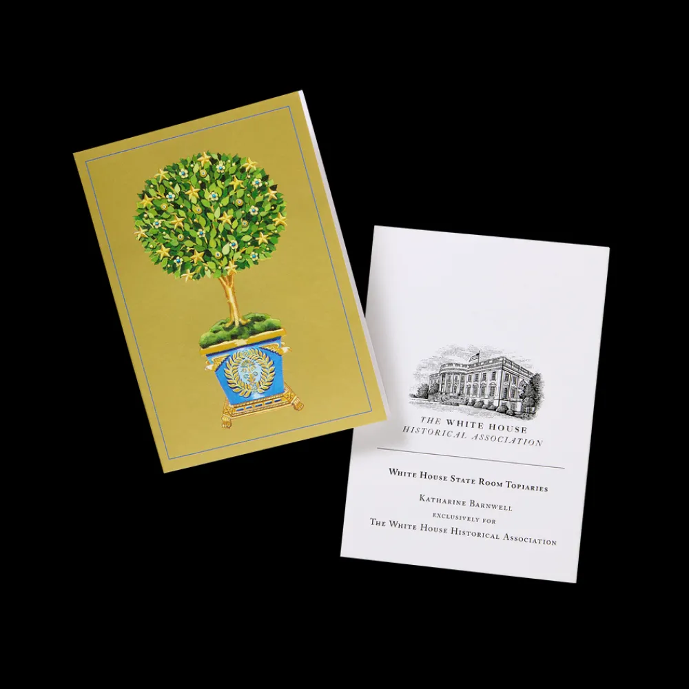 American artist Katharine Barnwell was inspired by the vibrant decor found in the State Rooms of the White House to create the whimsical set of topiaries featured on this set of cards.