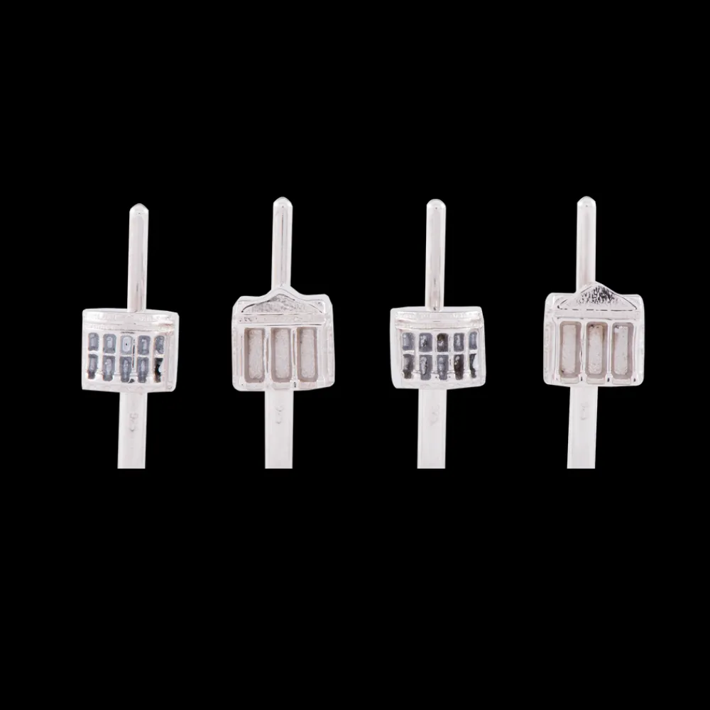 Created by American Artist Ann Hand of Washington, D.C., these elegant sterling silver White House tuxedo studs depict the north and south portico of the White House. A celebrated artist, Hand has combined her knowledge of Hollywood designers and observations of the dedication of leaders in Washington, D.C., to create her one-of-a-kind jewelry. She works in gold and silver and her jewelry has been worn by an array of clients, including first ladies, ambassadors, congresswomen, and young military wives.