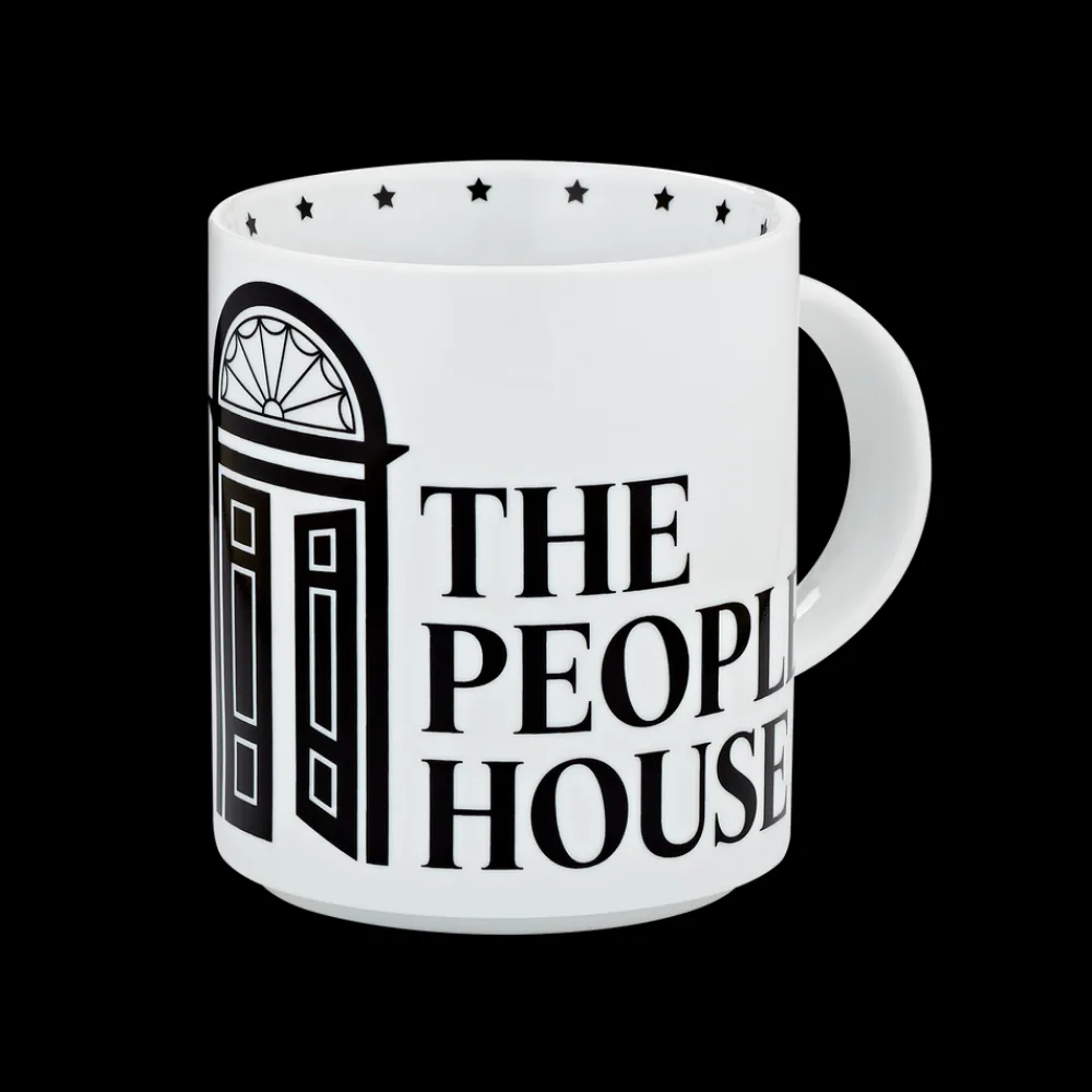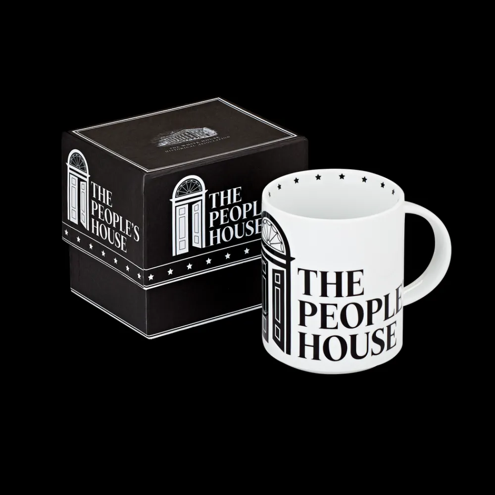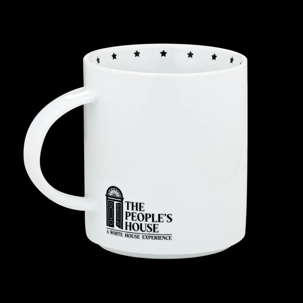 This 16 ounce black and white logo mug features the iconic People’s House logo. The perfect addition to your mug collection, this porcelain mug has personality inside and out. Two logos adorn the exterior, while patriotic stars dance along the interior rim. Mug comes in a giftable, decorative box. Elevate your morning routine with this exclusive mug that is both microwave and dishwasher safe.