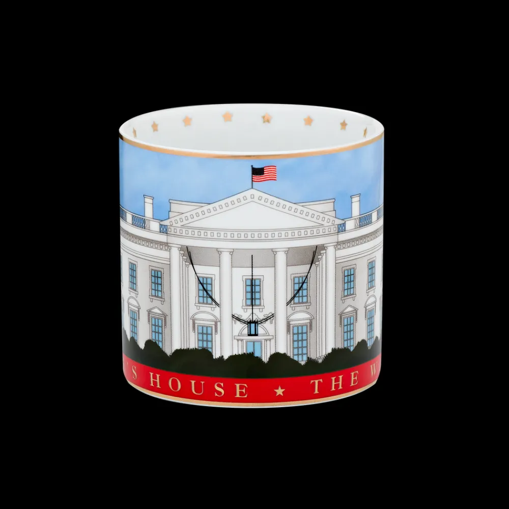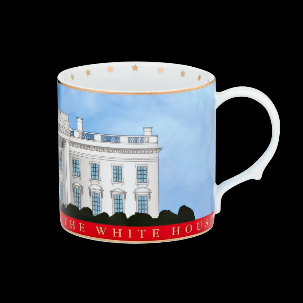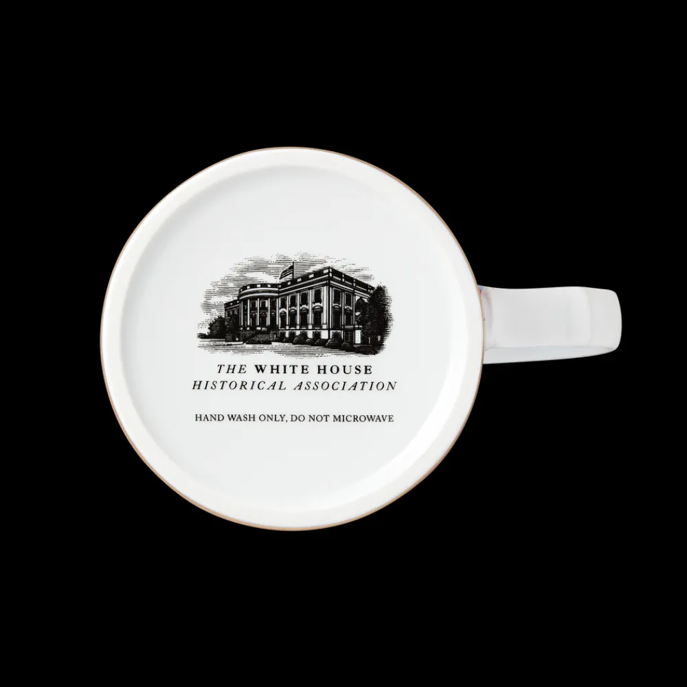 The elegant 12 ounce porcelain mug features a watercolor illustration of The White House. Adorned with gold foil details along the rim and handle, it reads “THE PEOPLE’S HOUSE. THE WHITE HOUSE.” along the base of the mug in foil lettering. Mug comes in a giftable, decorative box. Not microwave safe.