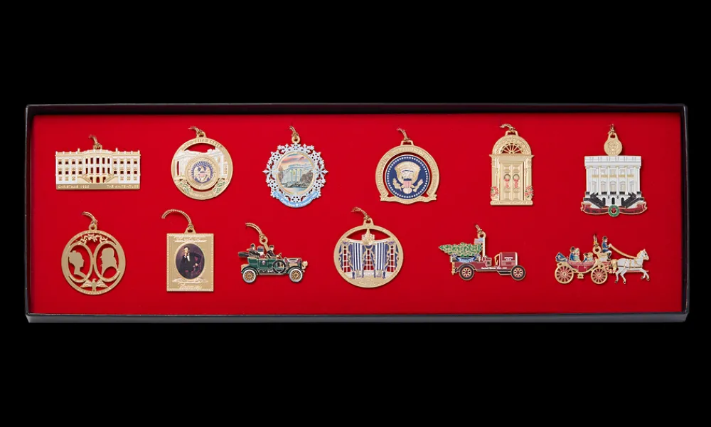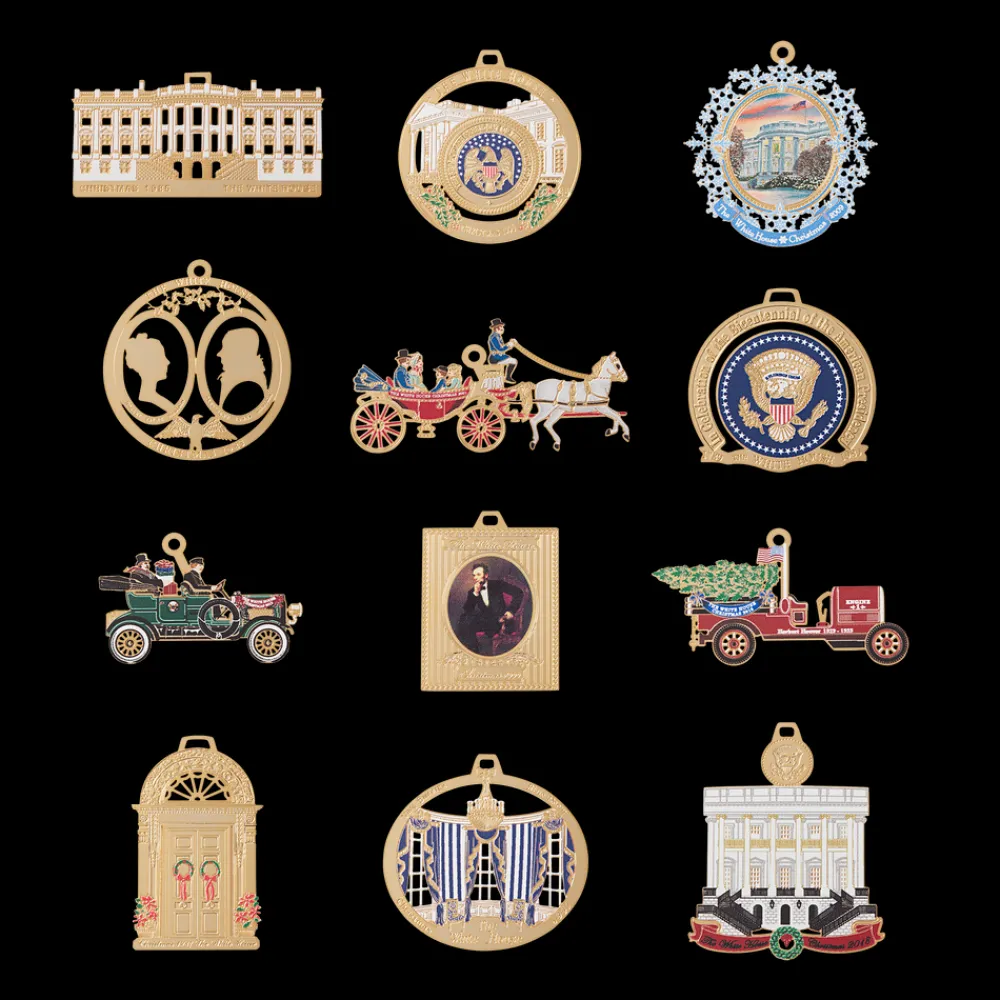 Introducing the White House miniatures, inspired by the Official White House Christmas Ornaments. These small ornaments are a great addition to any small tree. Set of 12 ornaments.