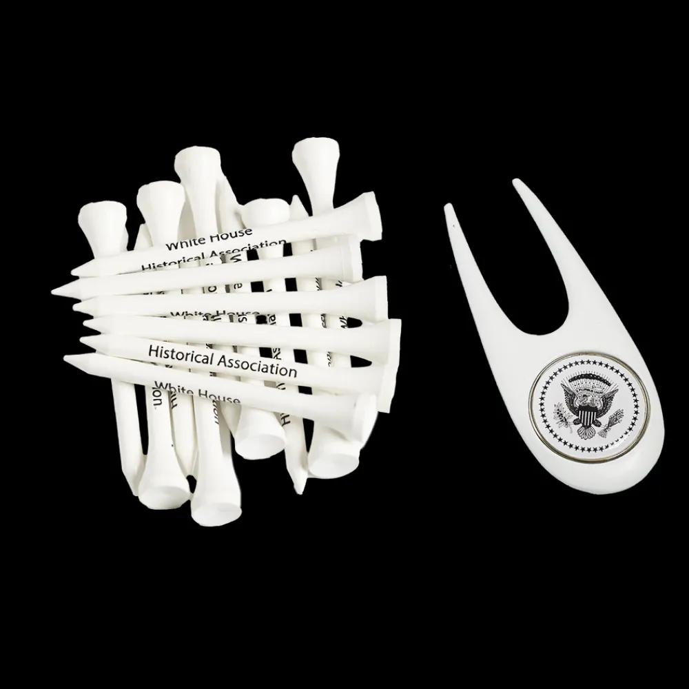 Tee off on the green with this elegant set of tees and divot tool with Truman Seal marker. Includes (15) 2 3/4 inch white wood tees and a nickel Scotsman Divot Tool with Truman Seal marker. Packaged in a plastic pillow pack.