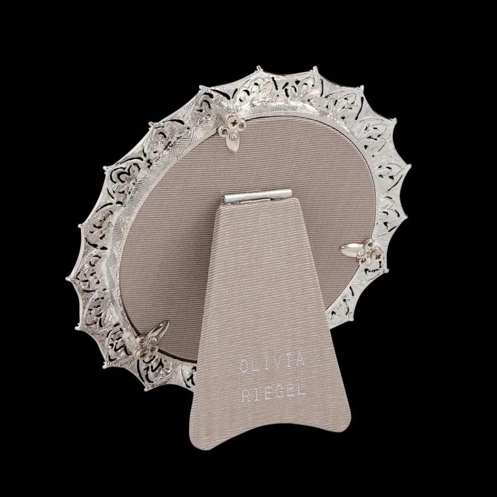 This elegant round silver frame, adorned with European crystals, moire silk, and beveled glass will add a unique Victorian flare to any home.