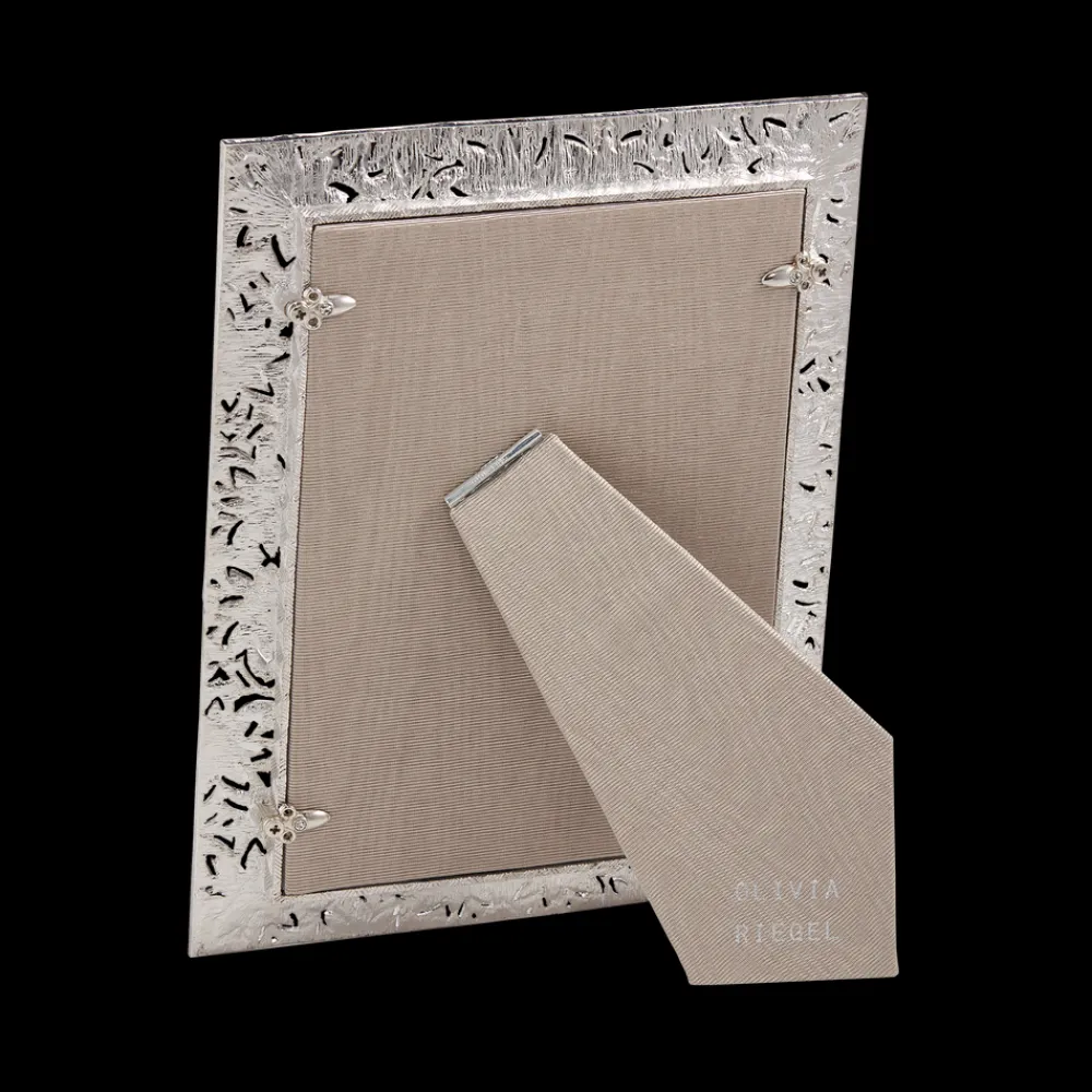 This elegant silver frame, adorned with European crystals, moire silk, and beveled glass will add a unique Victorian flare to any home.