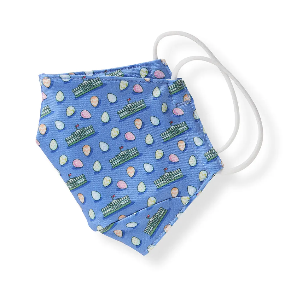 Keep the whole family safe during Easter with our pair of children sized Vineyard Vines masks. This light blue mask is imprinted with colorful Easter eggs and the facade of the White House. These masks are one size. Due to the personal nature of this product, this item cannot be returned.