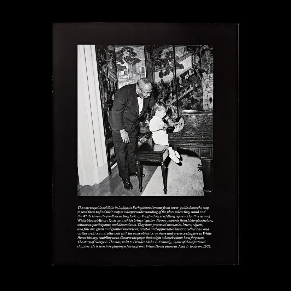 The new wayside exhibits in Lafayette Park pictured on our front cover guide those who stop to read them to find their way to a deeper understanding of the place where they stand and the White House they will see as they look up. This issue of White House History Quarterly, celebrates the act of wayfinding by bringing together diverse accounts from history’s scholars, witnesses, participants, and descendants. They have preserved memories, letters, objects, and fine art; given and granted interviews; created and appreciated historic collections; and visited archives and attics, all with the same objective: to share and preserve chapters in White House history, enabling us to discover the pages that might otherwise have been forgotten.