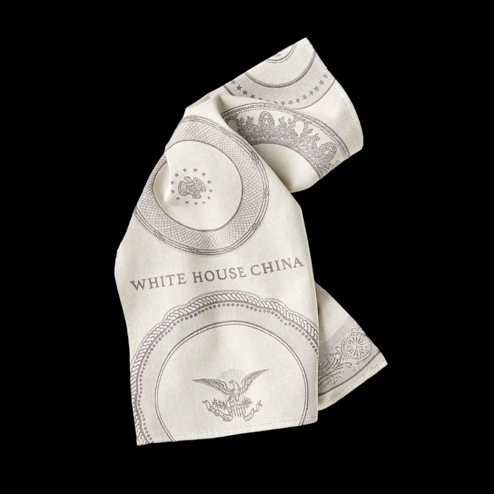 This unique tea towel features Official White House China dinner plates from various presidencies, including Abraham Lincoln, Benjamin Harrison, William McKinley, Franklin Roosevelt, Bill Clinton, George W. Bush, and Barack Obama.