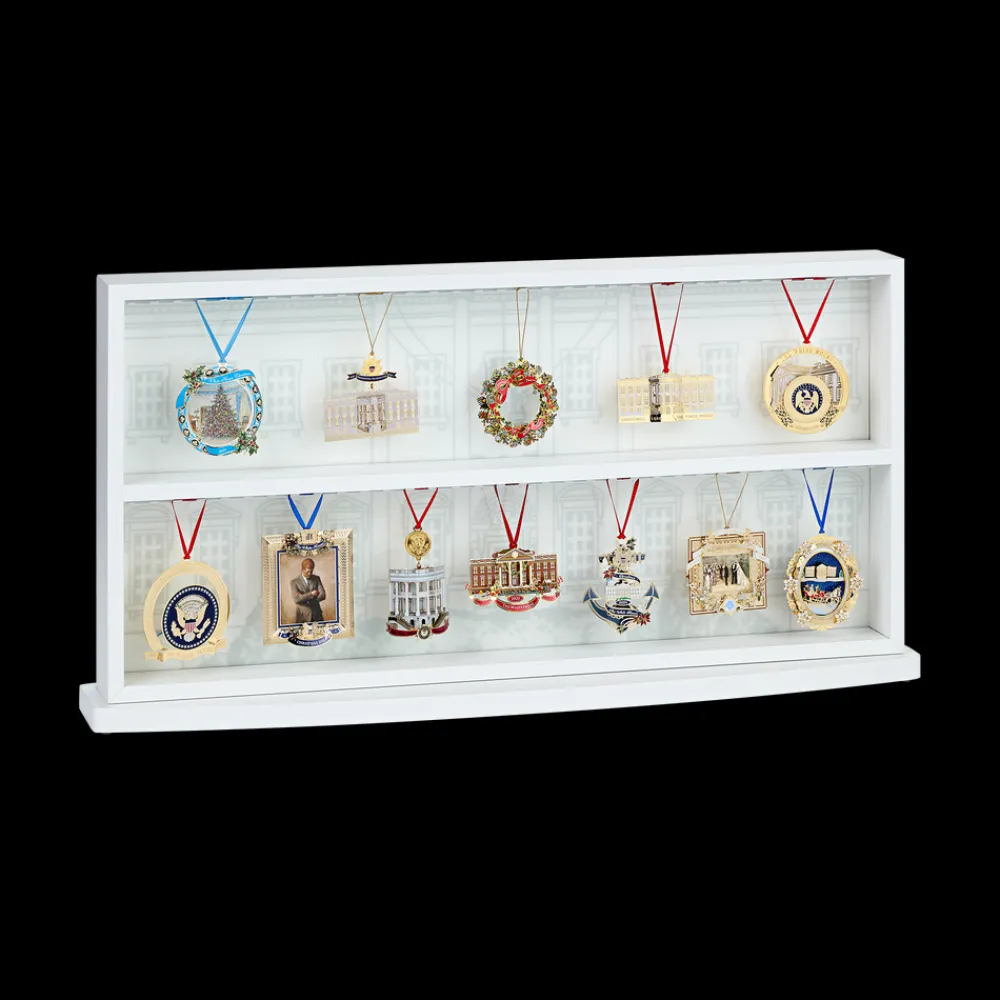 NOW 20% OFF FOR THE HOLIDAYS! Present your collection of Official White House Christmas Ornaments in style with our first ever White House Christmas Ornament display case. Each case comes with 15 red satin ribbons for an exquisite presentation. Back of the fixture has thoughtful mounting slots for balanced hanging. Some assembly required.
