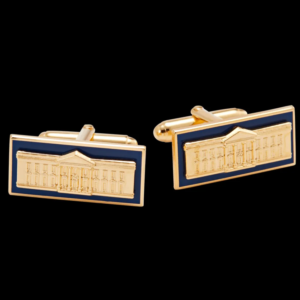 These brass plated with gold cuff links feature the North Portico of the White House on a stately navy blue enamel background.