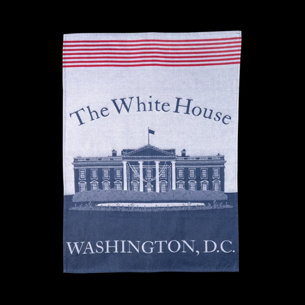 This classic tea towel has an embroidered rendering of the North Portico of the White House.