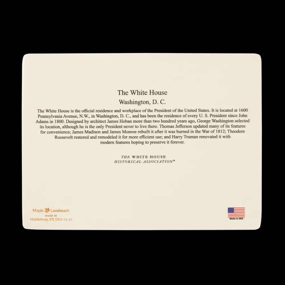 Explore the unique architecture of the White House while assembling this wooden puzzle of the South Portico grounds of the President’s House. Created for ages 3+ and inscribed with White House history for your little one to absorb. <