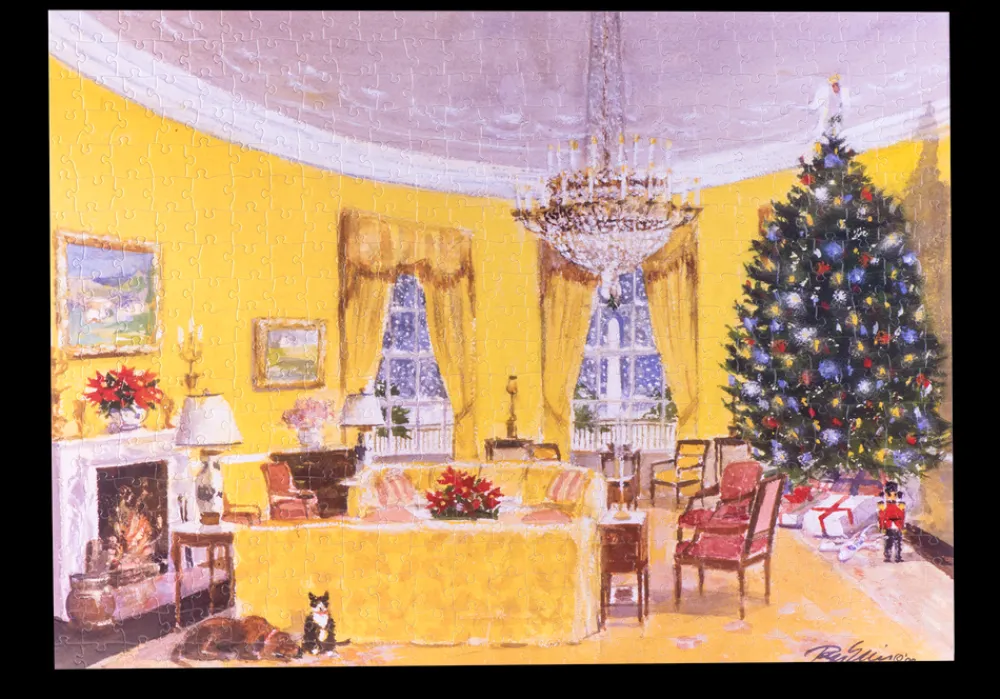 This 500 piece puzzle is based on a watercolor by Ray Ellis titled The Yellow Oval Room, First Family Residence, The White House, 2000. It depicts the Yellow Oval Room during the administration of President William J. Clinton decorated for Christmas. Buddy and Socks, the Clinton family pets, are shown at left in front of the sofa. This painting is part of the White House Collection at the White House Historical Association. Made in the U.S.A.