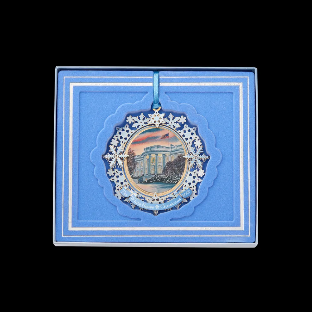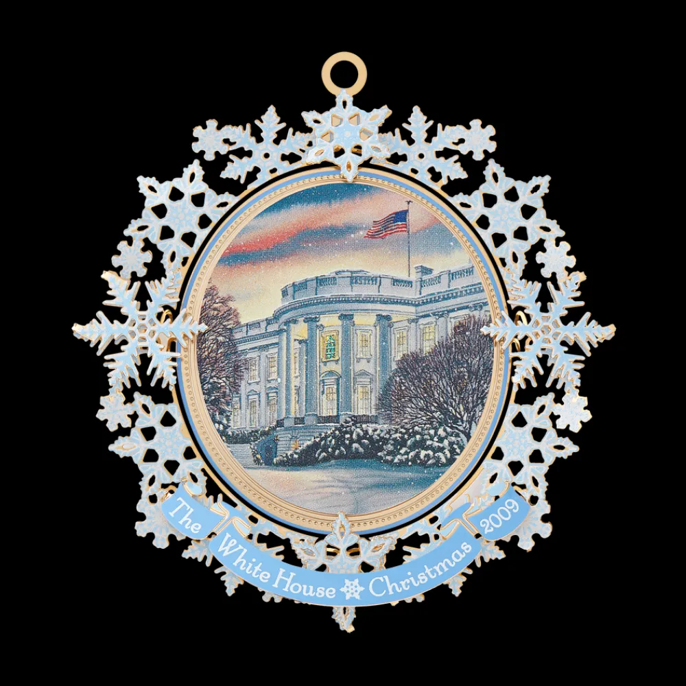 The only president of the United States elected to two non-consecutive terms, Grover Cleveland served as the 22nd president from 1885 to 1889 and as the 24th from 1893 to 1897. The 2009 White House Christmas ornament commemorates the 24th presidency and it is the second of two produced in Cleveland’s honor by the White House Historical Association. This second ornament illustrates the special place of the Christmas tree in the holiday celebrations of President Cleveland’s young family. The central hologram depicts the south façade of the White House after an evening snowfall. The warm glow of the first Christmas tree to be illuminated by electric lights is seen through the tall windows of the second floor Oval Room beyond the center of the columned portico. This softly colored view is based on a modern watercolor rendition by Margaret Huddy, a Washington, D.C.-based painter. The reverse side of the ornament recreates a scene from the tree-trimming parties of President and Mrs. Cleveland, which were held annually for their children and those of cabinet members. The words of a period newspaper report help to describe the president’s delight in preparing Christmas day for his young family. A finely crafted gold finished wreath of snowflakes, painted ice blue and white, frames the oval ornament.