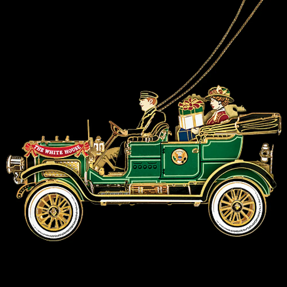 The Official 2012 White House Christmas Ornament honors President William Howard Taft who introduced the automobile to White House transportation in 1909, breaking a long presidential tradition of reliance on horse-drawn vehicles. The ornament celebrates Taft’s adoption of the automobile, his love of manufacture and invention, and his ready acceptance of modernity. It depicts President and Mrs. Taft enroute to deliver Christmas presents. They are seated behind chauffeur George H. Robinson in the White Motor Company’s Model M, a seven passenger steam-powered touring car embellished with the Great Seal of the United States on the doors. The color, as described at the time, is “a harmonious blend of subdued greens.” The President William Taft White House ornament for 2012 is made in the United States of highly-polished brass with a coating of nickel, finished in 24-karat gold.